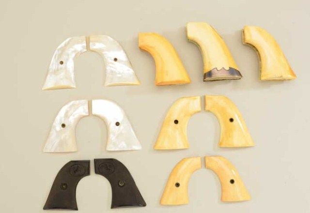 Lot of eight pair of ivory and pearl grips, mostly for Colt SAA revolvers including two beautiful iridescent pearl sets of grips in very good to fine condition, one pair of checkered black hard rubber grips in verygood + condition, one pair of one piece SAA grips in very good condition, one pair of two piece ivory grips for a SAA, one pair of ivory two piece grips likely for a medium frame percussion Colt type revolver in goodcondition and a lovely pair of ivory one piece grips for a Colt 1871-1872 revolver with pierced silver butt caps in fine condition; a great lot of desirable grips! Est.: $750-$1,500.