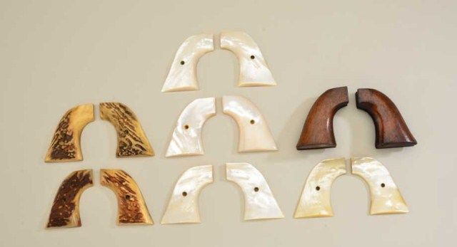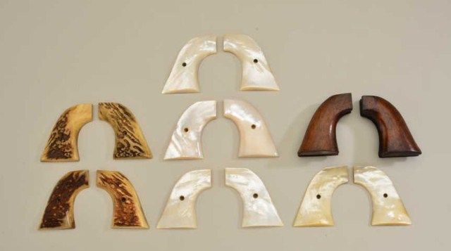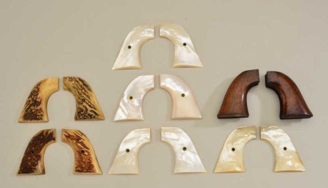 Lot of eight pairs of grips for Colt revolvers including two pair of thick stag grips for the Colt SAA, four pairs of beautiful iridescent pearl grips also for the SAA and two pair of one piece wood grips,also appearing to be for SAAs. Est.: $800-$1,600.