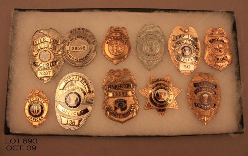 Lot of eleven misc. security badges in riker case including an older William J. Burns Detective Agency; a Pinkerton Security Services; Commonwealth of Kentucky ; Inter-Con Healthcare, etc. An instant mini-collection. Est.:$200-$300.