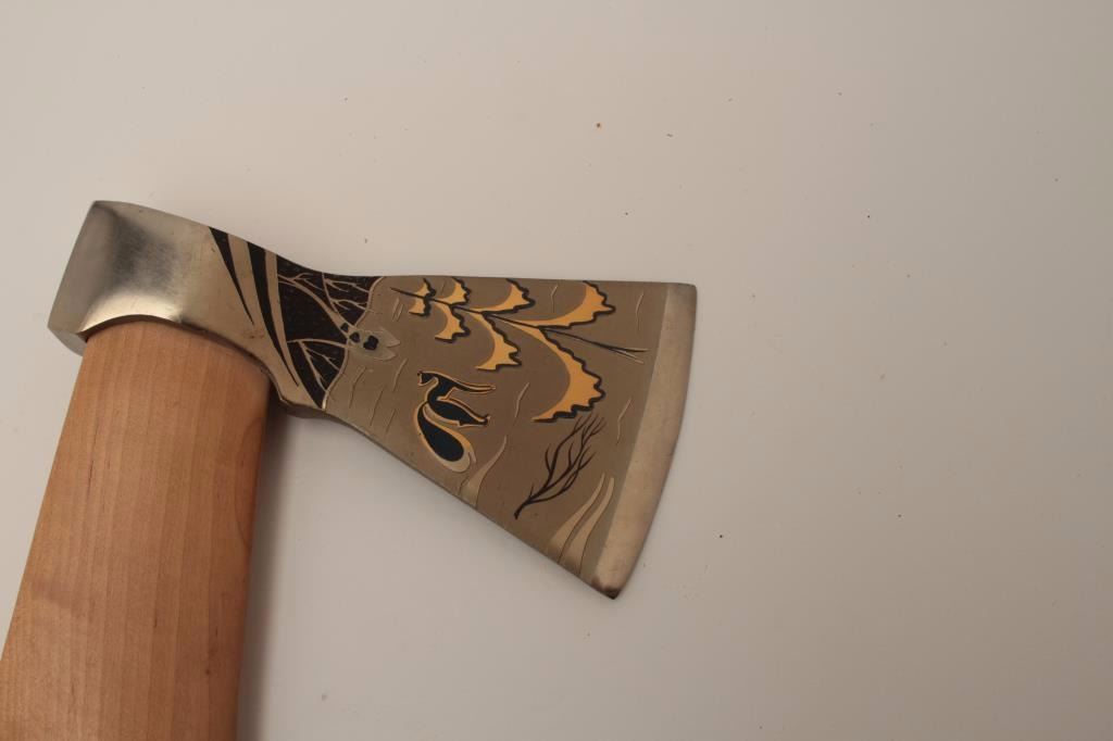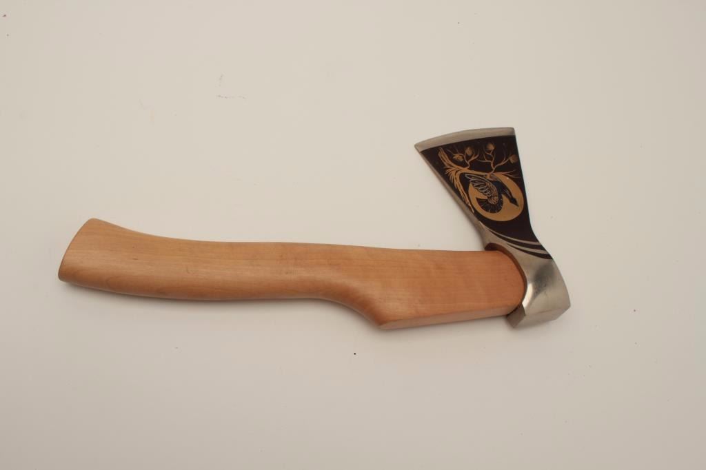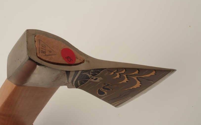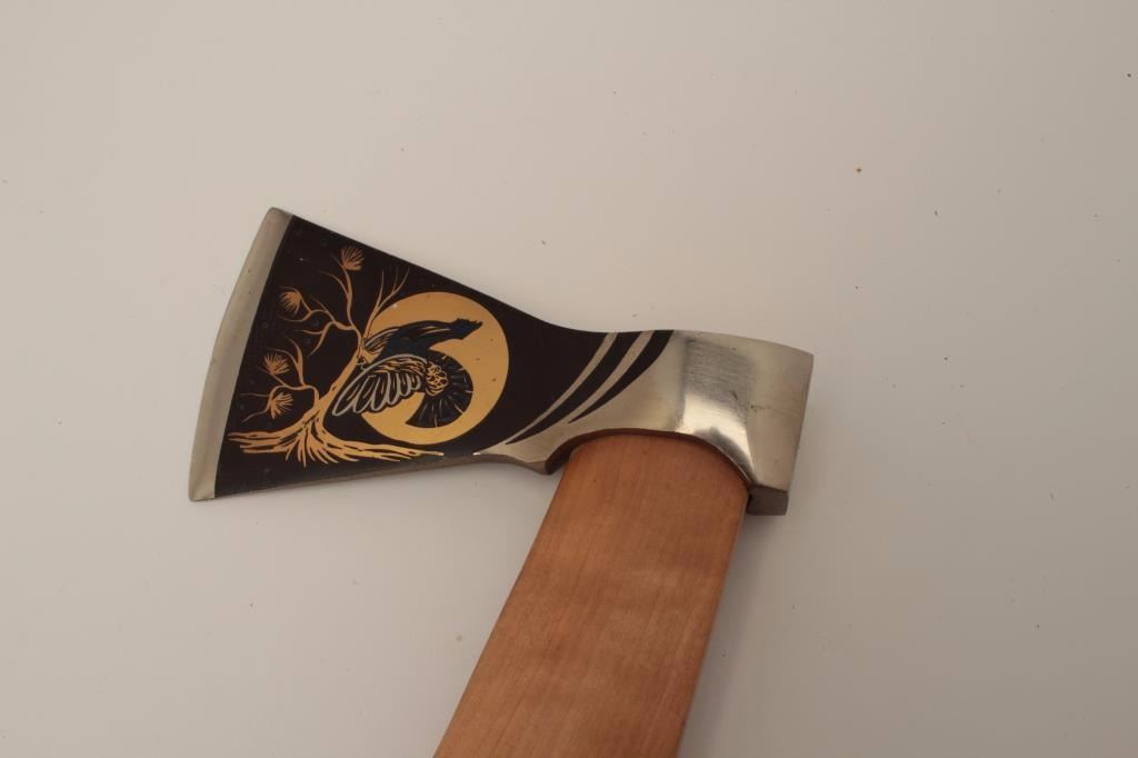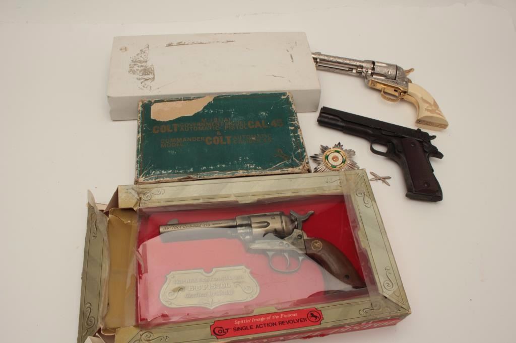 Lot of fancy decorated Northern European axe (Finland-Russia) along with daisy bb gun, Colt 1911 non gun, and emblem from Shako. Est.: $150-$300