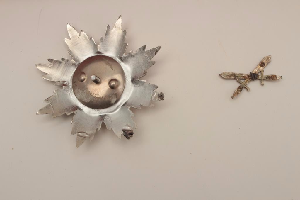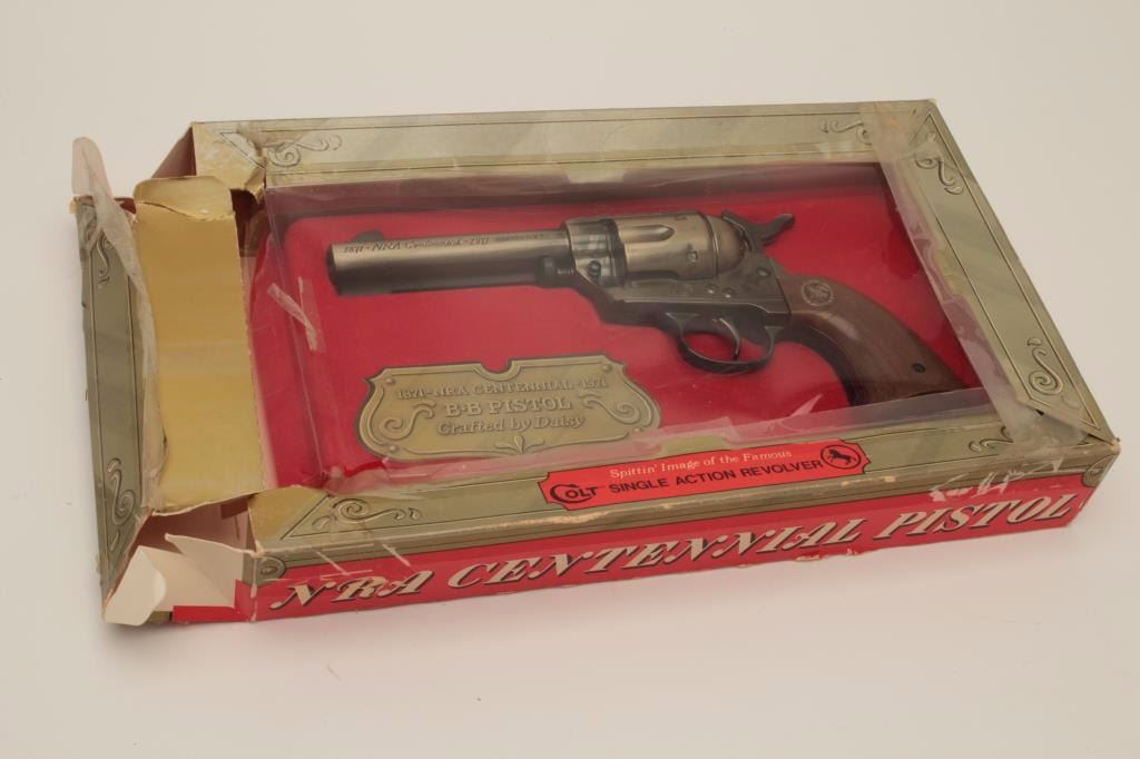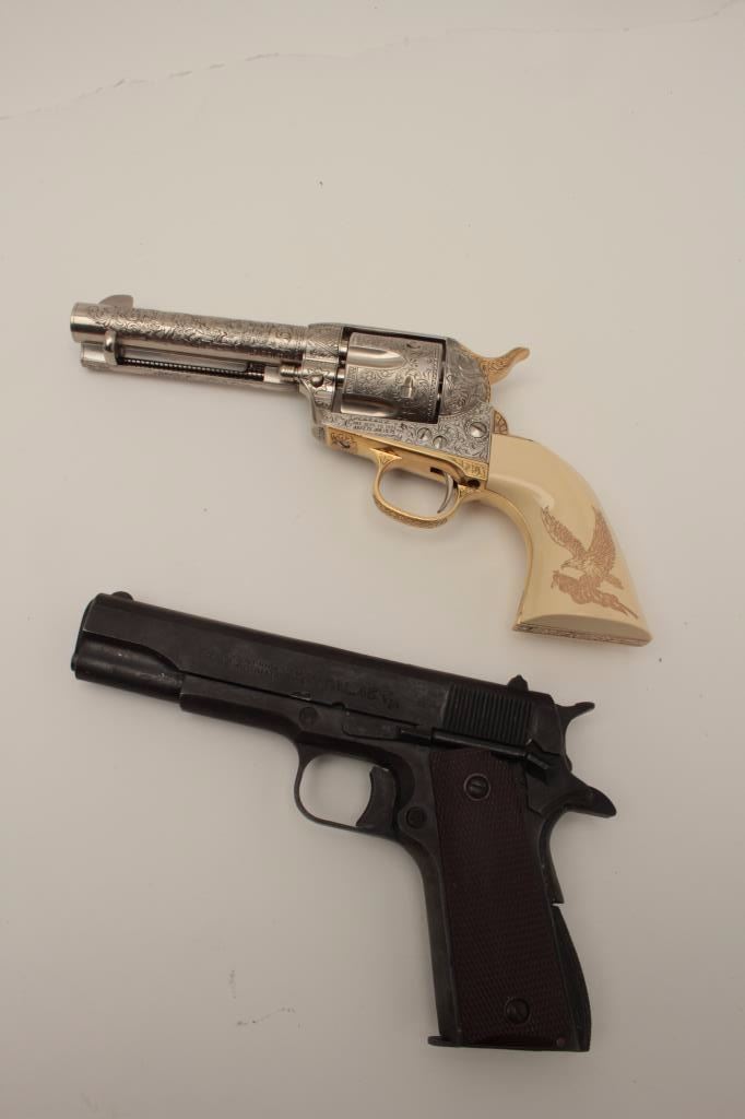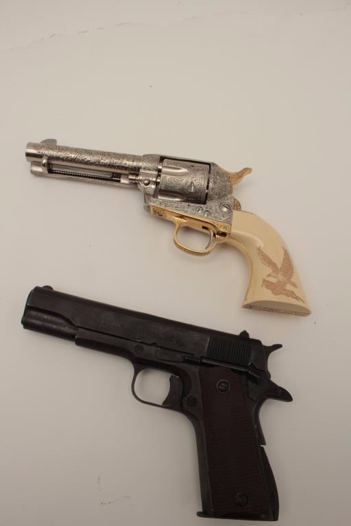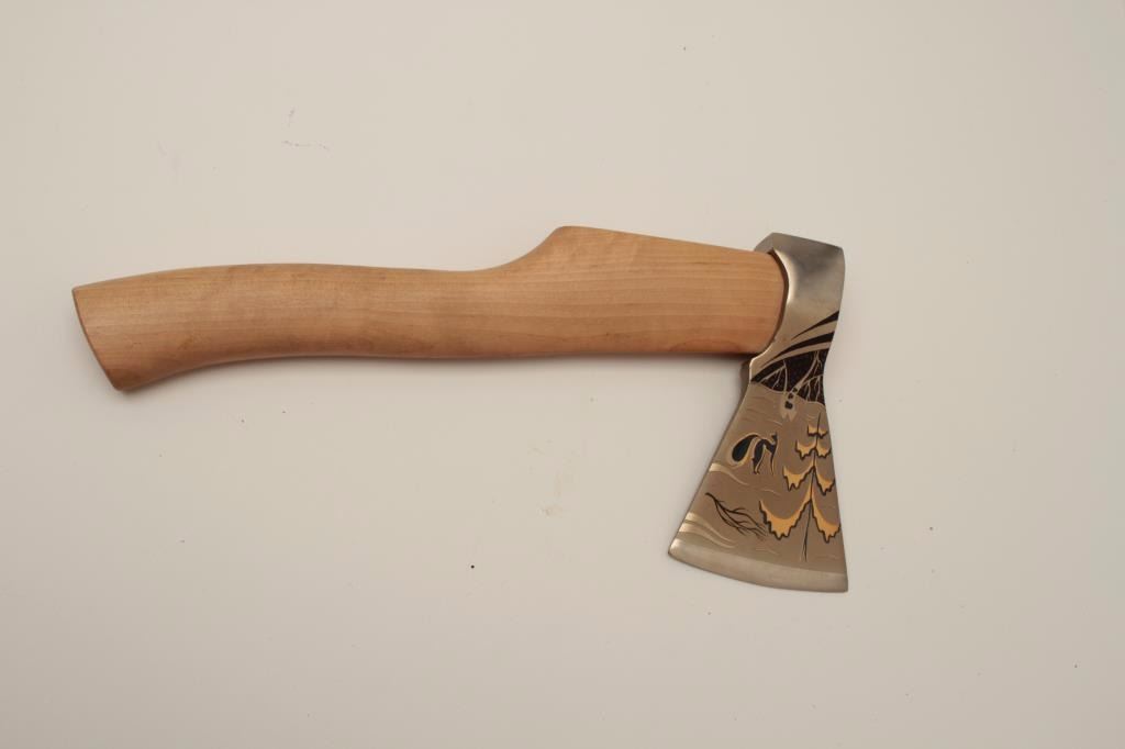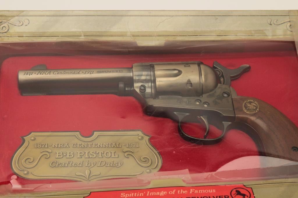 Lot of fancy decorated Northern European axe (Finland-Russia) along with daisy bb gun, Colt 1911 non gun, and emblem from Shako. Est.: $150-$300