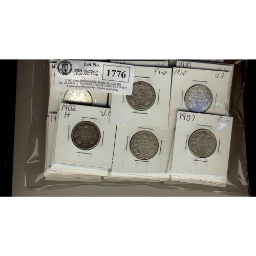 Lot of fifty-eight 25 cents; Includes 1902, 1902H, 1906 (8), 1907 (16), 1909 (2), 1910 (30). All VG-8 or better.