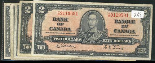 Lot of five 1937 $2 notes BC-22b and 22c. Grades vary from Fine to F+.