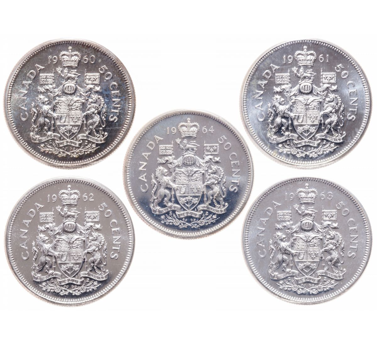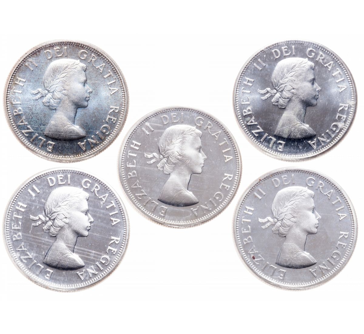Lot of five (5) ICCS Elizabeth II 50 cents, including: 1960 PL-67; 1961 PL-67 Heavy Cameo; 1962 PL-67 Cameo; 1963 PL-66 Ultra Heavy Cameo; 1964 PL-67 Ultra Heavy Cameo.