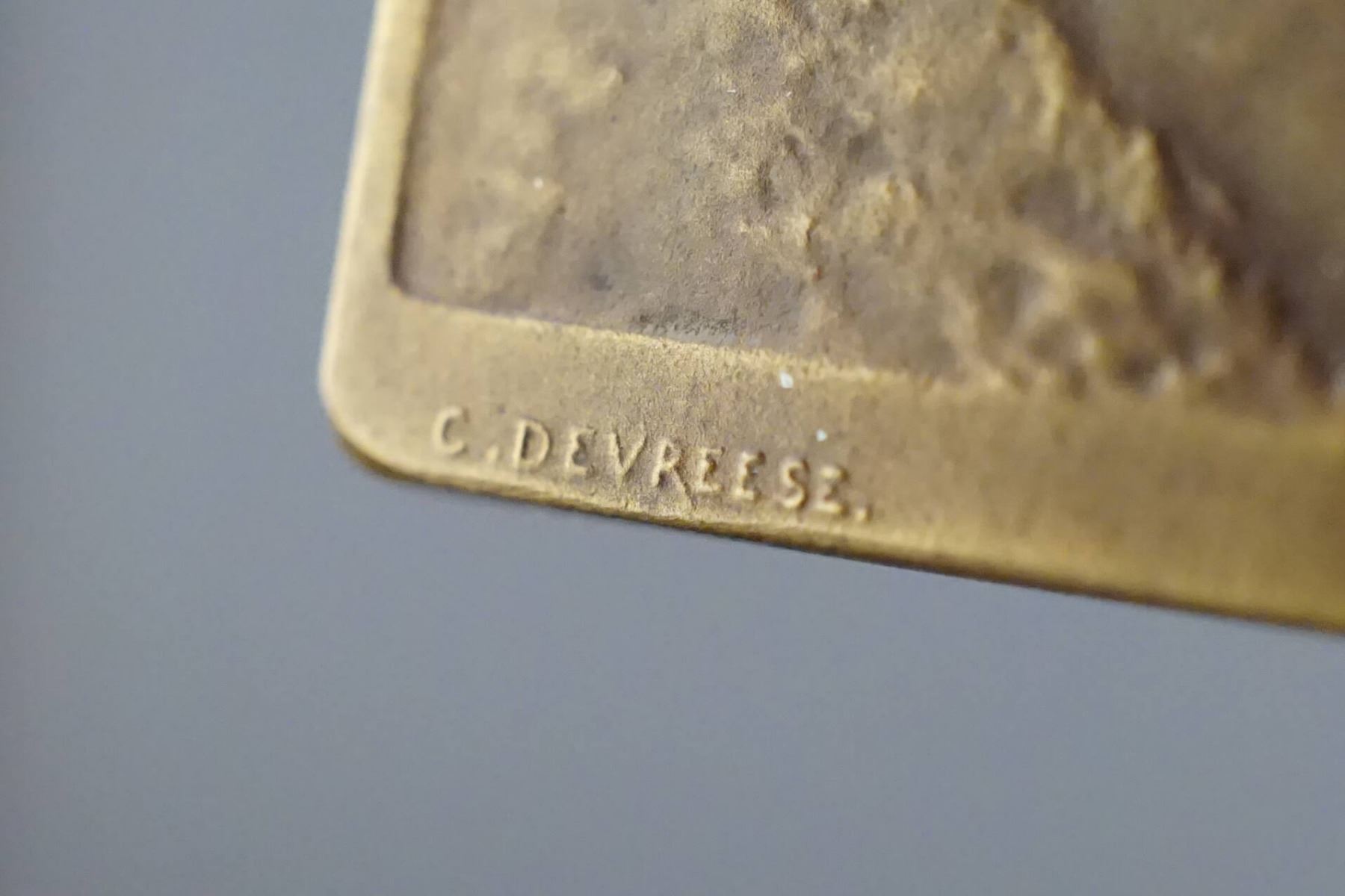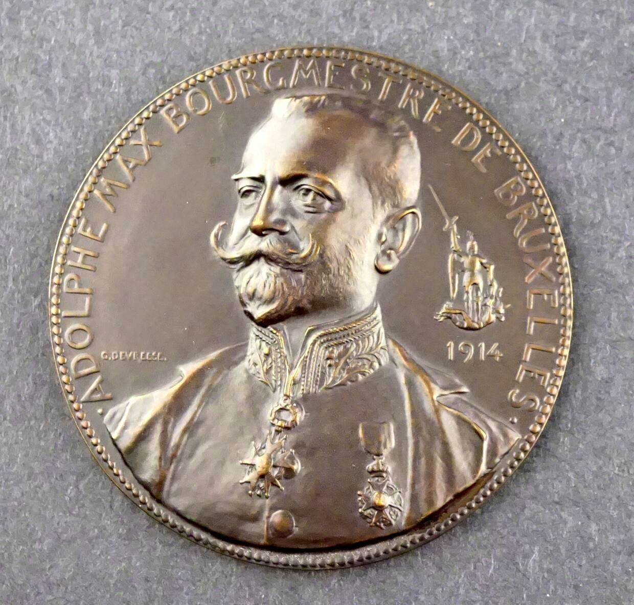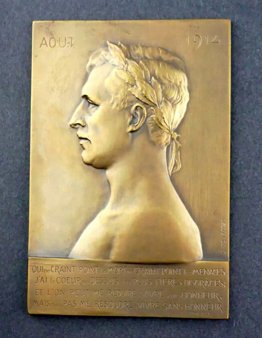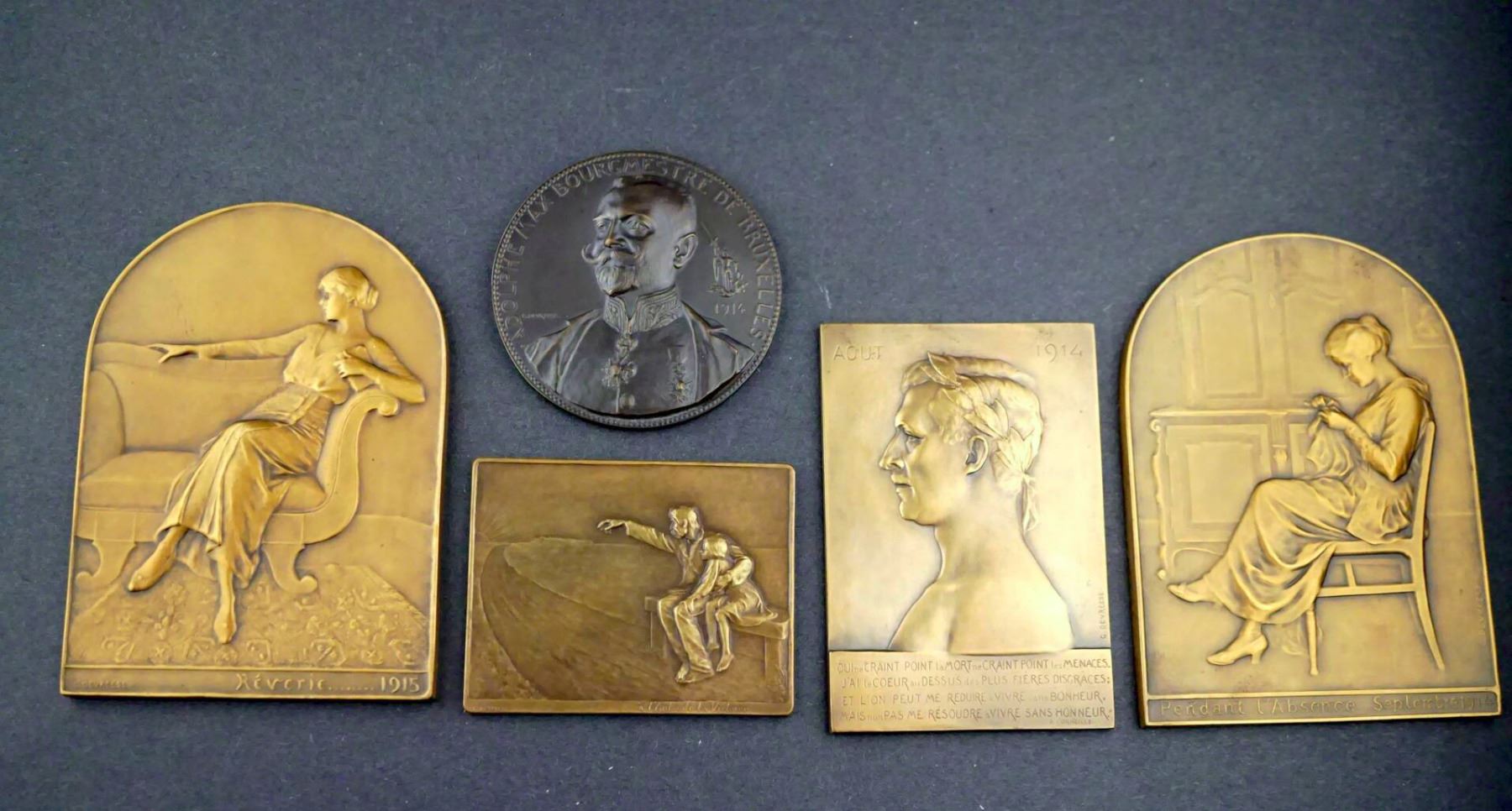 Lot of five Belgian Commemoratives Medals, Plaques, of the Great War, Designed Signed by G. DEVRESS. 1) Possibly struck just before the outbreak of the Great War. ADOLPHE MAX BOURGMESTRE DE BRUXELLES 1914. Be-medalled bust, semi-facing, left. To the right, a small figure of St. George. Standing on the dragon, with sword upraised. Below: 1914. To left, above the shoulder, the signature: G.DEVREESE. On the Reverse: LES VIRTUS CIVIQUES / JUSTICE, VIGILENCE, CHARITÉ. At center, a coq standing, one foot raised; behind, the scales of justice. Below, the signature, G. DEVRESS, Choice condition. 64 mm, 95.9 grams. 2) Bronze Plaque, 55 x 70 mm, 82.1 grams. Obverse depicts an old man, his left arm around a boy sitting with him on a bench at the side of a road leading off into the distance, his right arm raised and pointing down the road, On the lower right edge: À l'aube de la victoire. On the Reverse: A poem or text in script. 3) Large Bronze Uniface Plaque. Shirtless laureate bust to left, possibly the King. Above, AOUT at left, 1914 at right. Text of P. CORNEILLE at bottom 61 x 90 mm, 168.5 grams. 4) and 5) Two matching uniface bronze plaques, rounded on top, 78 x 110 mm, 285.6 grams, #4, and 317.8 grams. #5. Both depict seated women, facing left. The first, on a wooden chair, sewing, a large cabinet behind. Below: Pendant L'Absence Septembre 1914. 5) has her seated of the left side of a divan. her right arm outstretched on top. Below: "Reverie..........1915".