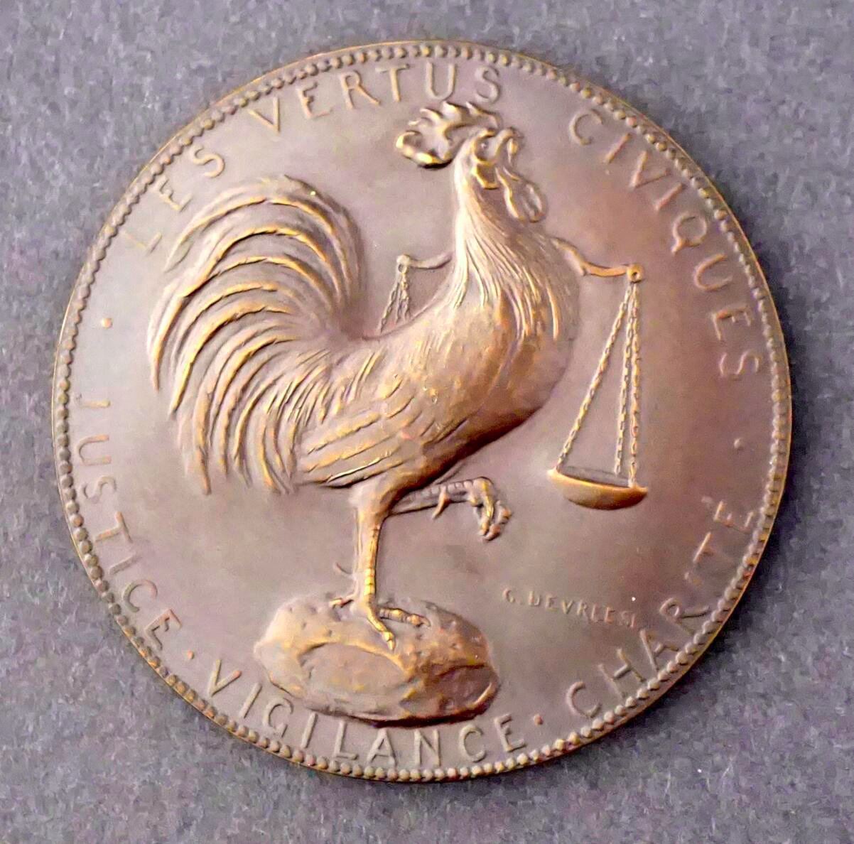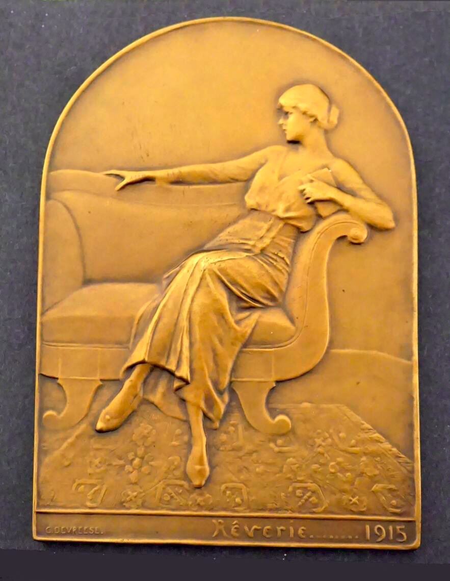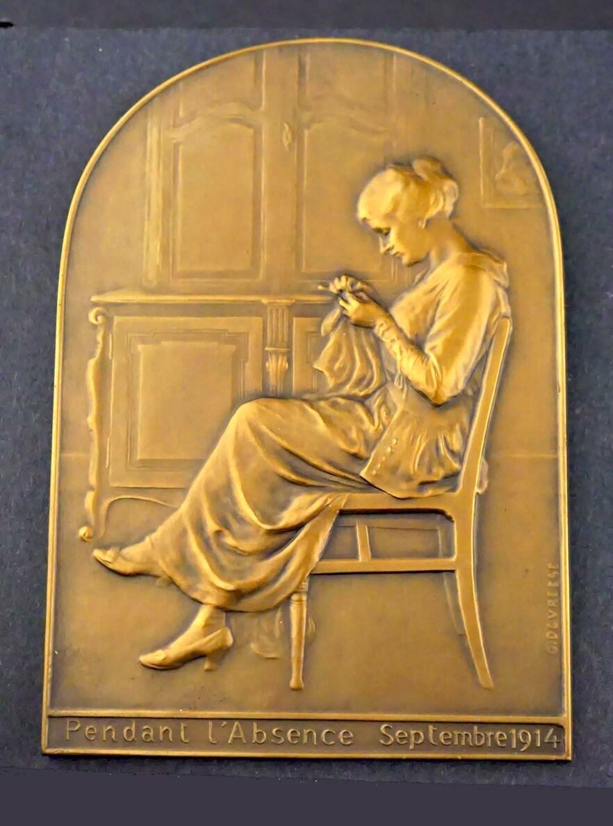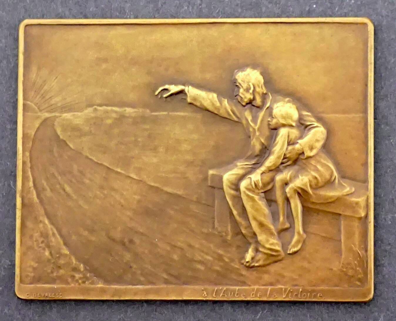 Lot of five Belgian Commemoratives Medals, Plaques, of the Great War, Designed Signed by G. DEVRESS. 1) Possibly struck just before the outbreak of the Great War. ADOLPHE MAX BOURGMESTRE DE BRUXELLES 1914. Be-medalled bust, semi-facing, left. To the right, a small figure of St. George. Standing on the dragon, with sword upraised. Below: 1914. To left, above the shoulder, the signature: G.DEVREESE. On the Reverse: LES VIRTUS CIVIQUES / JUSTICE, VIGILENCE, CHARITÉ. At center, a coq standing, one foot raised; behind, the scales of justice. Below, the signature, G. DEVRESS, Choice condition. 64 mm, 95.9 grams. 2) Bronze Plaque, 55 x 70 mm, 82.1 grams. Obverse depicts an old man, his left arm around a boy sitting with him on a bench at the side of a road leading off into the distance, his right arm raised and pointing down the road, On the lower right edge: À l'aube de la victoire. On the Reverse: A poem or text in script. 3) Large Bronze Uniface Plaque. Shirtless laureate bust to left, possibly the King. Above, AOUT at left, 1914 at right. Text of P. CORNEILLE at bottom 61 x 90 mm, 168.5 grams. 4) and 5) Two matching uniface bronze plaques, rounded on top, 78 x 110 mm, 285.6 grams, #4, and 317.8 grams. #5. Both depict seated women, facing left. The first, on a wooden chair, sewing, a large cabinet behind. Below: Pendant L'Absence Septembre 1914. 5) has her seated of the left side of a divan. her right arm outstretched on top. Below: "Reverie..........1915".
