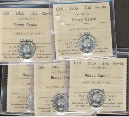 Lot of five ICCS MS64 HEAVY CAMEO graded coins. Includes 1956 (3), 1958 and 1964. All pieces are brilliant.