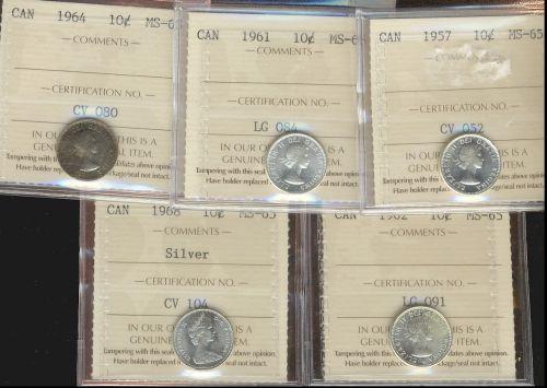 Lot of five ICCS MS65 graded coins. Includes a 1957, 1961, 1962, 1964, 1968 Silver. Only the 1964 is toned.