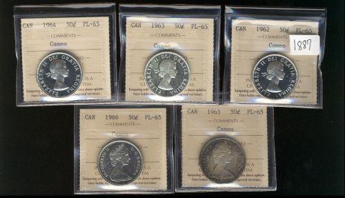 Lot of five ICCS PL65 CAMEO graded coins. Includes a 1962, 1963, 1964, 1965 and 1966. Only the 1965 is lightly toned.