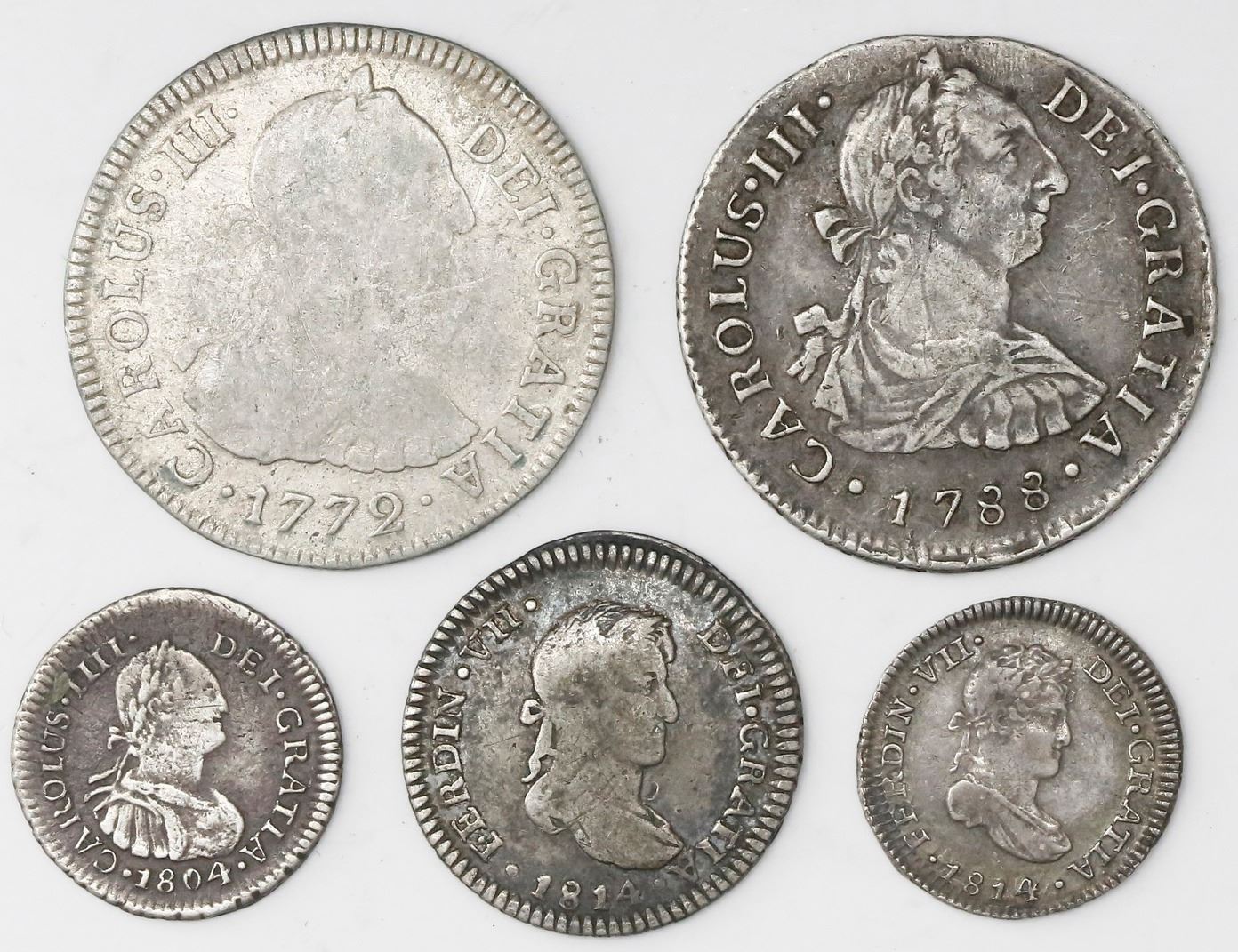 Lot of five Lima, Peru, bust 2R (two), 1R (two) and 1/2R (one), various kings and dates. 19.80 grams total. Varied lot that includes the key first date 1772JM in VG/Fine, the others being around VF to XF, some with cleaning and light marks.
