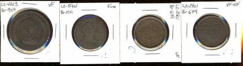 Lot of five Lower Canada tokens including a LC-9A2 Breton #521, LC-24A1 Breton # 679 (2), LC-47D3 Breton # 959, LC-57A1 Breton # 1011. Grades vary from F to VF+. A nice lot.