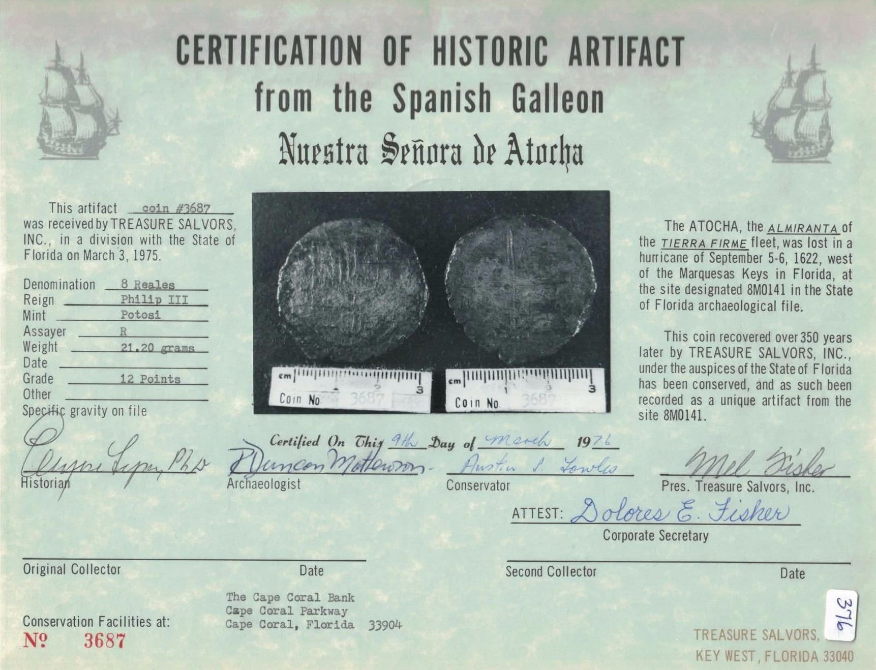 Lot of five Potosi, Bolivia, cob 8 reales, Philip III, various assayers (where visible), all Grade-3 quality (12 to 13 points each), with hand-signed certificates from 1976. KM-10. 98.99 grams total. All fairly solid but corroded, lightly toned, with clear shields and crosses. With original, hand-signed photo-certificates from 1976 (Cape Coral Bank) numbered 2847, 2997, 3318, 3395 and 3687. SEE INTERNET FOR PHOTO. Recovered from: Atocha, sunk in 1622 west of Key West, Florida