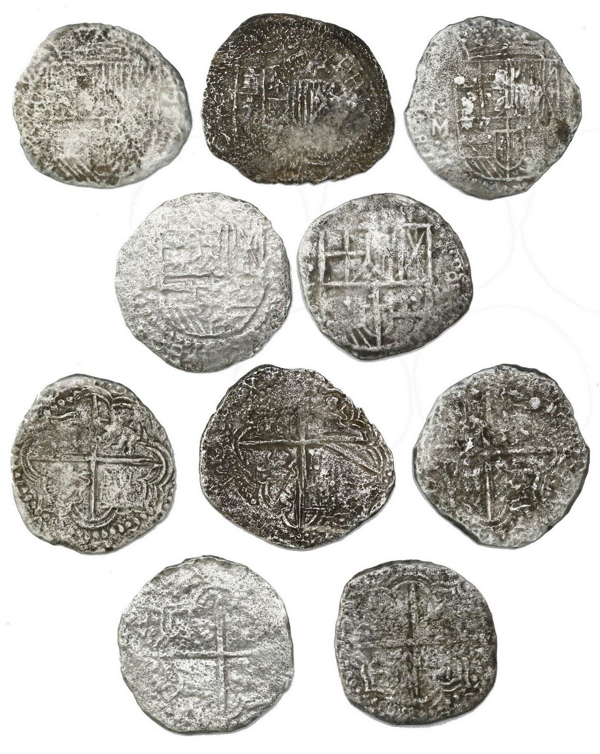 Lot of five Potosi, Bolivia, cob 8 reales, Philip III, various assayers (where visible), one Grade 2 and three Grade-3 quality (one 44 points and three 12 points each), with hand-signed certificates from 1976 and 1982. KM-10. 95.25 grams total. Generally moderately corroded but with clear shields and crosses. The 44-point coin is misdescribed as dated 1620 on the certificate but no date is visible. With original, hand-signed photo-certificates from 1976 (4, Cape Coral Bank) and 1982 (1) numbered 4065, 4284, 4281 4374 and SR 1398. SEE INTERNET FOR PHOTO. Recovered from: Atocha, sunk in 1622 west of Key West, Florida