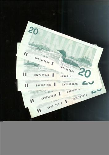 Lot of five "RADAR" notes. BC-58d 1991 $20 EWR2732372, EWR7579757, EWV4081804, EWW7615167, EWY9461649. Grades vary from VF to EF.