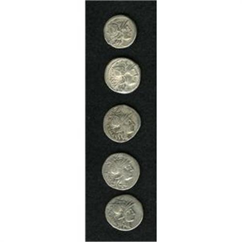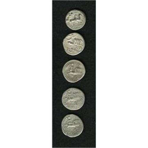 <B>Lot of five Roman Republican denarii.</B></I> Includes: M. Tullius (3) // M. Aburius Geminus // C. Maianius. <B>Average near VF.</B></I><BR><BR><b>Shipping:</b> Coin/Currency (<a target="_blank" href="http://www.heritageauctions.com/common/shipping.php">view shipping information</a>)