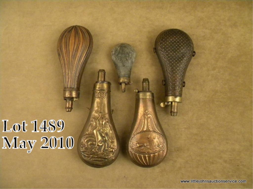 Lot of five antique brass powder flasks all in uncleaned good to very good condition including a large shotgun flask with embossed game scenes approx. 8” x 3-1/4”; a ribbed shotgun flask approx. 7-1/2” x 3”; a Dixon star and circleshotgun flask approx. 7-1/2” x 3-1/2”; a game scene shotgun flask approx. 7” x 3-1/2” and a small pistol flask with scallop design, approx. 4-1/2” x 2”. A nice group of early flasks. Est.: $175-$375.