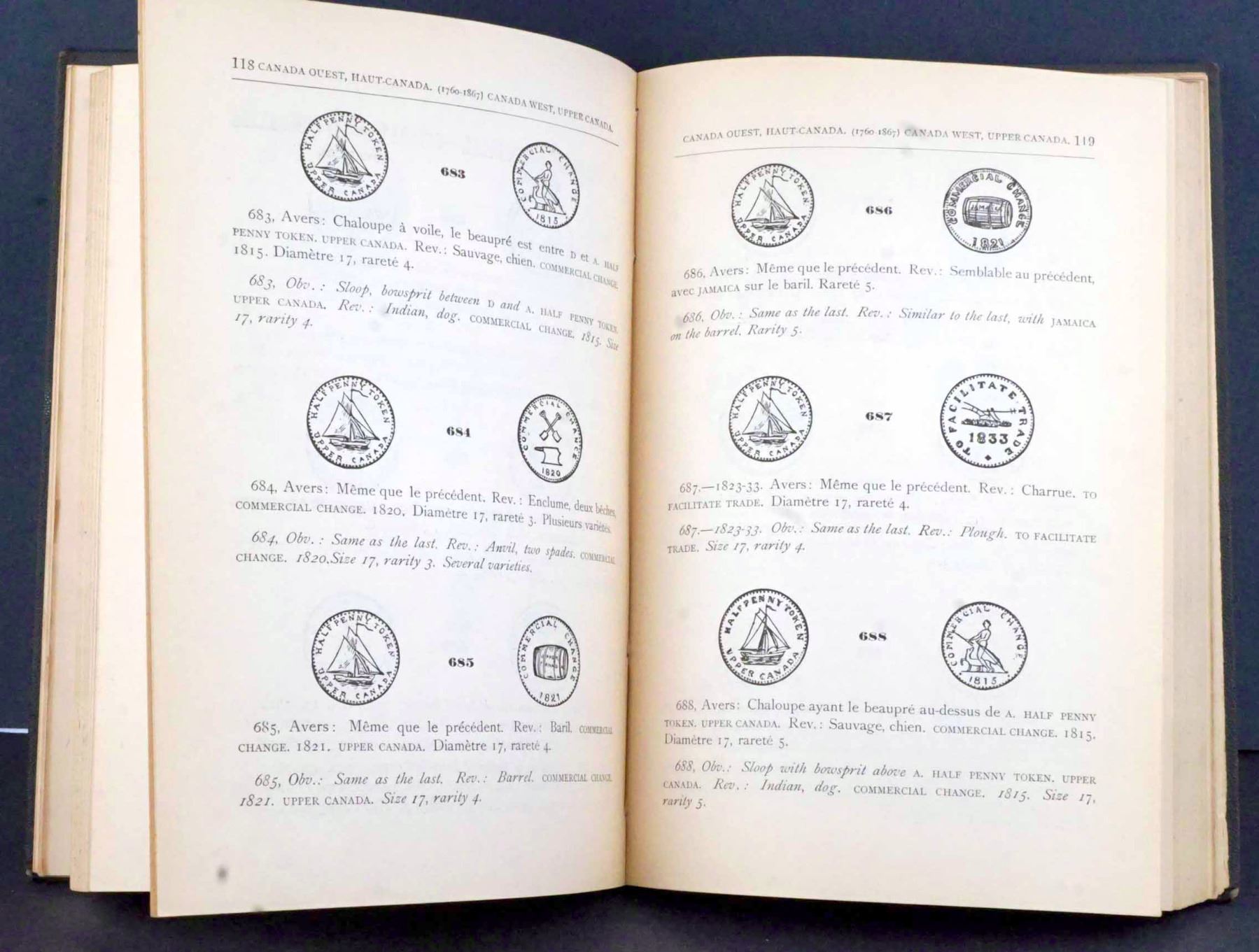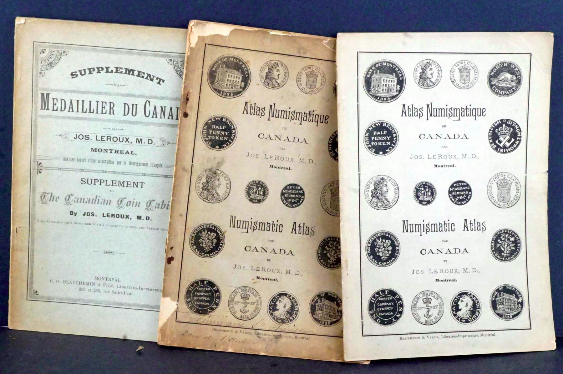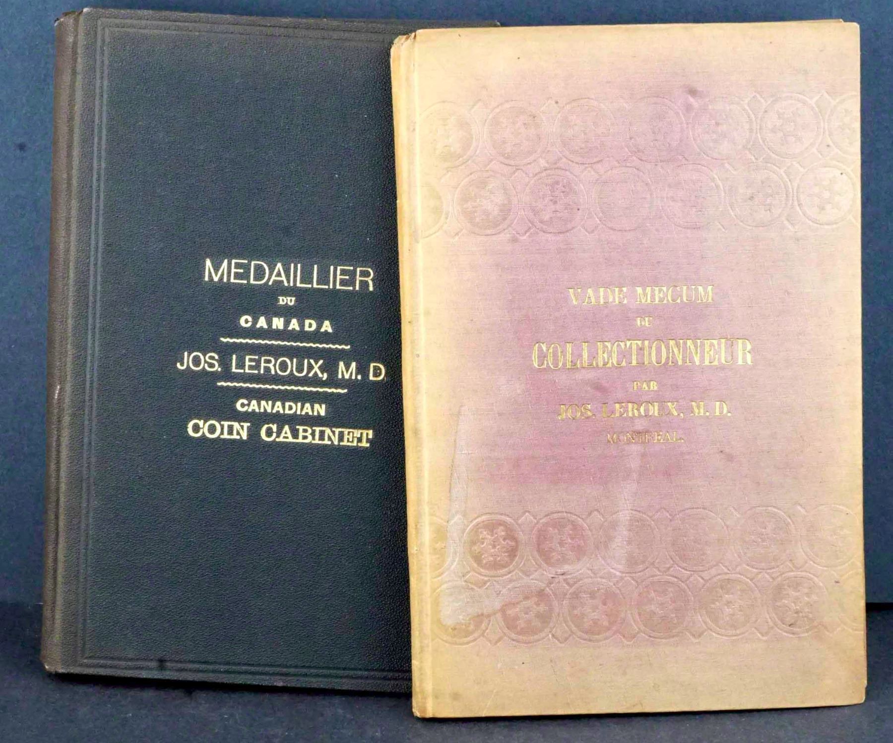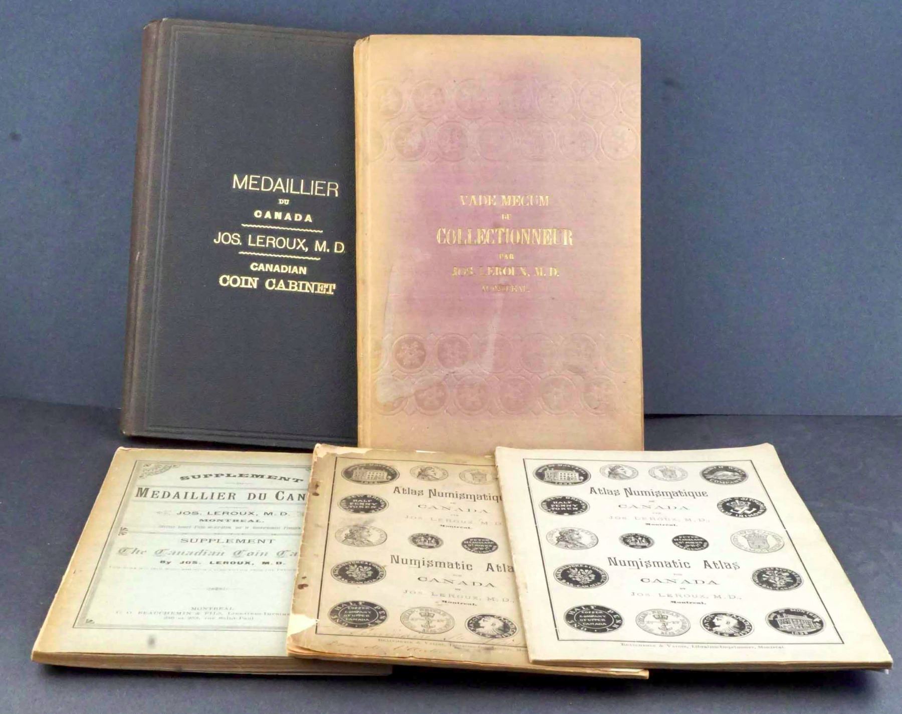 MEDALLIER du CANADA - CANADIAN COIN CABINET by JOS. LEROUX, M. D. Bilingual. Also Included - SUPPLEMENT MEDALLIER du CANADA (ND); VADE MECUM du COLLECTIONNEUR by JOS. LEROUX M. D. 1855, Montreal. Plus two copies of ATLAS NUMISMATIQUE du CANADA (1883). Lot of five books by Jos. Leroux. Bound in black cloth, stamped in gilt on the cover. 308 pages, profusely illustrated. Introductory remarks dated 1888. A very nice copy, with only a little fraying on the spine, top. On top of first cover page : Seminaire St. Charles Borromé Sherbrooke - :"Musée" 2) Bound in tan cloth, Fair condition, cover attached by the cords only, paper having split. Otherwise clean and complete. 3) SUPPLEMENT. Paper bound, very nice copy. Roughly 100 pages, unnumbered. No annotations, 4) and 5) Atlas paper bound booklet, 35 pages, One copy bright and tight, with some light cover damage, including a 2 cm tear. The other copy really shows its age.