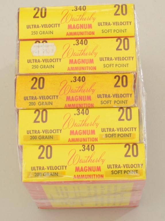 Lot of five boxes of Weatherby .340 Magnum ammunition, ultra-velocity soft point; 200 and 250 grain. Est.: $150-$300.