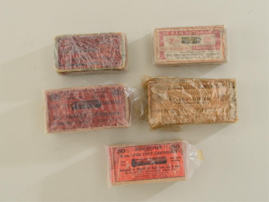 Lot of five collector boxes of ammo in assorted calibers by Winchester, UMC and Peters, one or two appear full, several partials; one is for S&W .38-44 Target revolvers and in very good condition, another is .41-100 Long although the box is in need of careful conservation and repair. From the Dr. John Hall Collection. Est.: $150-$300.