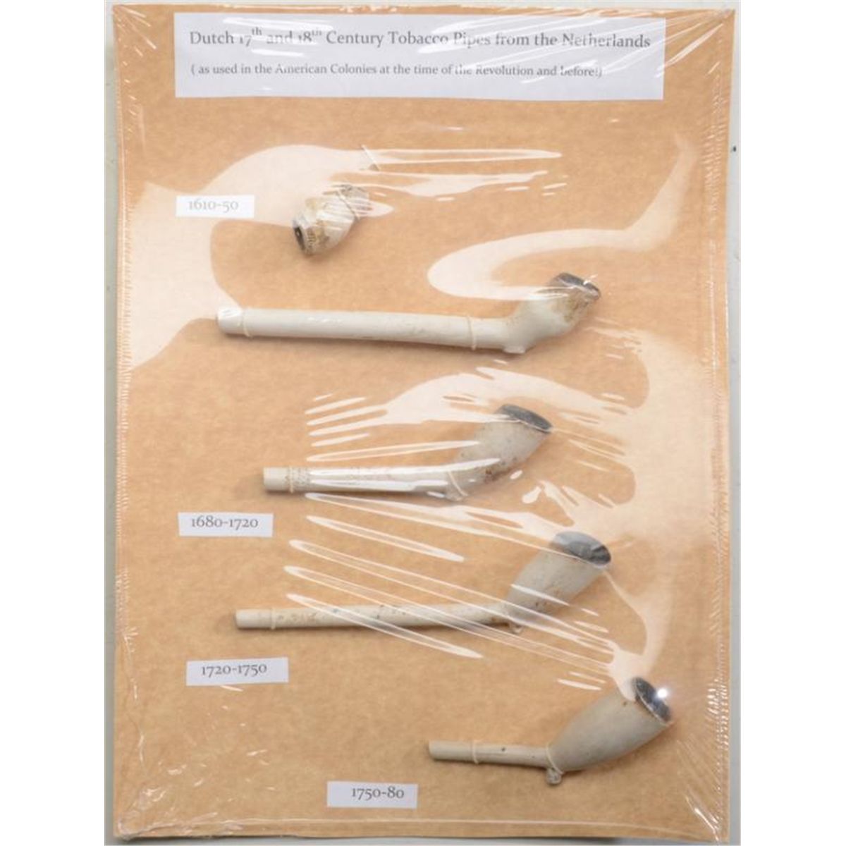 Lot of five early Dutch 17th and 18th Century tobacco pipes from the Netherlands on a cardboard backing that has been shrink wrapped for protection; all show evidence of having been used given the coloring of thebowls; the earliest example is just the bowl while the other four retain varying portions of their stems. A great little “instant collection” of these artifacts that were popular in the American colonies before theRevolution. Est.: $35-$60.