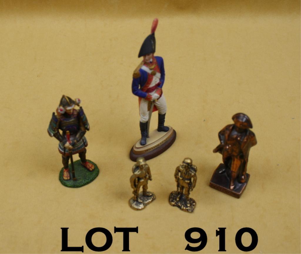 Lot of five figurines including a nicely painted samurai, approx. 4” high, a painted plastic “William Clark”, approx. 6” high, two cast brass German soldiers, approx. 2-1/2” high each and a metal figure of Napoleon, approx. 4” high. Est.: $50-$100.