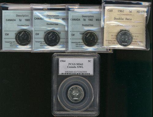 Lot of five interesting varieties. Includes a 1962 "Double date" ICCS MS63, 1964 XWL PCGS MS63, 1982 "Double date" CCCS MS65, 1984 "Double date" CCCS MS65, 1985 "Double date" CCCS MS66.