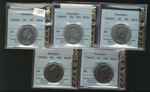 Lot of five interesting varieties. Includes a 1973 "Missing AD" CCCS MS-62, 1974 "Missing S" CCCS EF-40, 1982 "Small beads" CCCS MS-62, 1983 "Double date" CCCS MS-66, 1984 "Double date" CCCS MS-66.