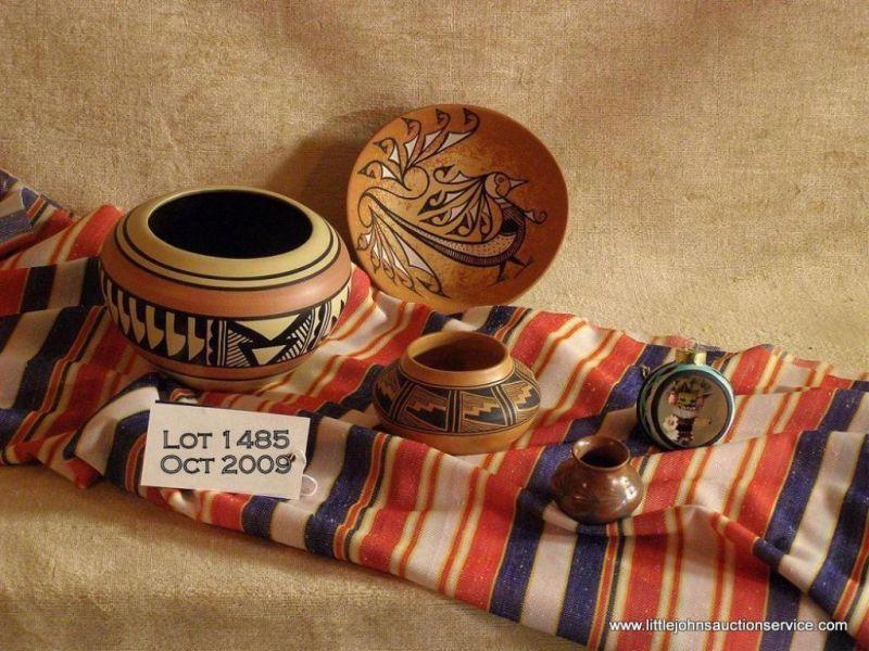 Lot of five misc. pieces of Native American pottery including a painted dish signed “Deldrick & Loronda Cellicion, Zuni, NM, 8/20/91”, approx. 7” in diameter in very good condition; a painted point, approx. 7” in diameter and approx. 5” inheight signed “D. Schmidt 23” in fine condition; a small painted pot, approx. 5” in diameter and approx. 3” in height, signed “Mark Wayne Garcia, Santo Domingo Pueblo” in fine condition; a miniature painted pot, approx. 2” in diameter andapprox. 2” in height signed “Trini Silverira” in fine condition, and a Christmas tree decoration hanging “ball”, approx. 2-1/2” in diameter and approx. 2” in height with a carved and painted Kachina doll inside and visible through the frontopening, in very good condition. Est.: $150-$250.