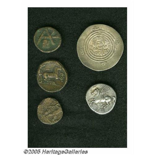 <B>Lot of five miscellaneous Greek coins.</B></I> Includes: Sicily, Syracuse. AE 21. Persephone / Biga // Macedonian Kingdom. Antigonos II Gonatas. AE 17 // Corinthia, Corinth. AR Stater // Argolis, Argos. AE 18 // Sasanian Kingdom. Xusro II. AR drachm. Average Fine to VF, the stater decent.