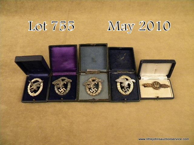Lot of five various cased Luftwaffe qualification badges. Conditions range from very good to excellent. Est: $1,500 - $2,500