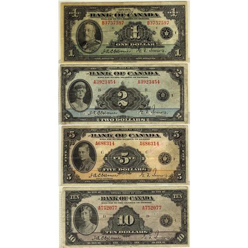 Lot of four 1935 "English" notes : BC-1 $1, BC-3 $2, BC-5 $5 , BC-7 $10 Grades vary from F-12 to F-15