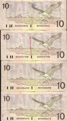 Lot of four 1989 $10 with the scarce prefix BDH, notes are all circulated. Average grade Fine. All have minor ink marks on them.