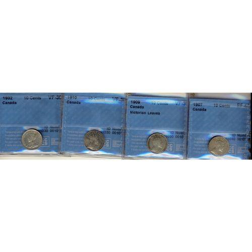 Lot of four CCCS graded 10 cents; 1907 EF-40, 1909 VL VF-30, 1910 VF-30, 1932 VF-30.