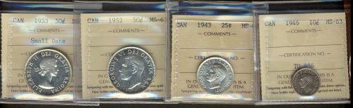 Lot of four ICCS graded MS63 coins. Includes a 10 cents 1946, a 25 cents 1943, and two 50 cents 1952 and 1953 Small Date.