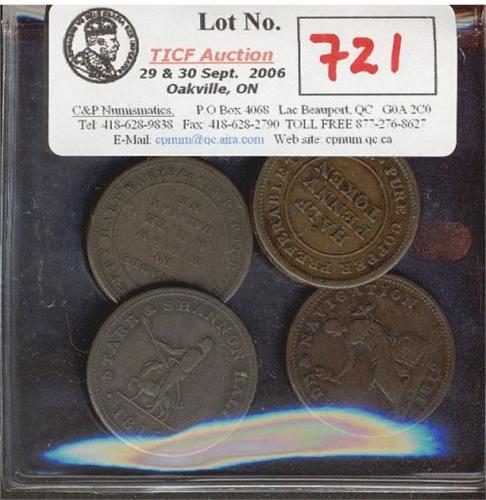 Lot of four Nova Scotia tokens including a NS-11A1 Breton # 884, NS13A1 Breton # 890, NS-19A Breton # 963, NS-19B2 Breton #963. Grades vary from F+ to VF+. A nice lot.