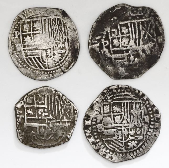 Lot of four Potosi, Bolivia, cob 2 reales, Philip II and III, assayers B, R and T. 27.05 grams total. Atocha-period coins but non-salvage. VF on average with patchy dark toning, full shields and crosses.