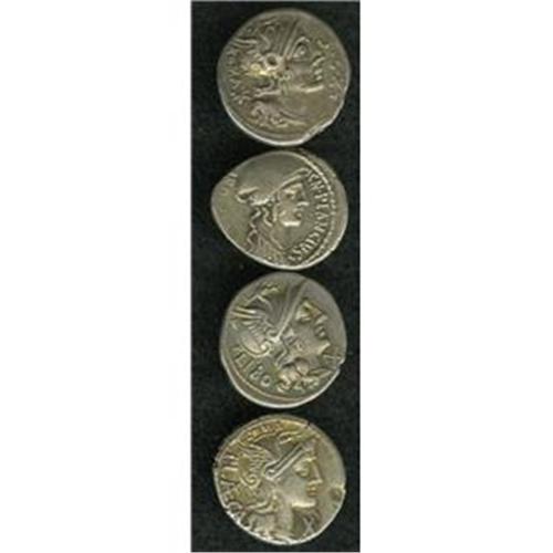 <B>Lot of four Republican denarii mostly from the Lord Grantley Collection.</B></I> Includes: Cn. Plancius. Diana Planciana / Cretan goat. Ex Lord Grantley Collection // Q. Marcius Libo. Roma / Dioscuri. Ex Lord Grantley Collection // M. Sergius Silus. Rome / Horseman // P. Porcius Laeca. Roma / Citizens and soldier. Ex Lord Grantley Collection. Average Fine to VF, all nicely toned.