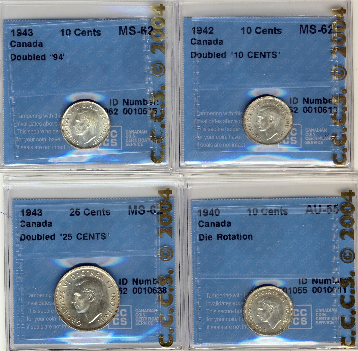 Lot of four VARIETY coins, all CCCS graded MS-62. 10¢ 1940 DIE ROTATION, 1942 DOUBLED 10 cents, 1943 DOUBLED 94, 25¢ 1943 DOUBLED 25 cents. A nice and interesting lot.