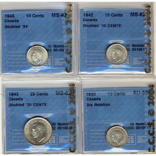 Lot of four VARIETY coins, all CCCS graded MS-62. 10¢ 1940 DIE ROTATION, 1942 DOUBLED 10 cents, 1943 DOUBLED 94, 25¢ 1943 DOUBLED 25 cents. A nice and interesting lot.