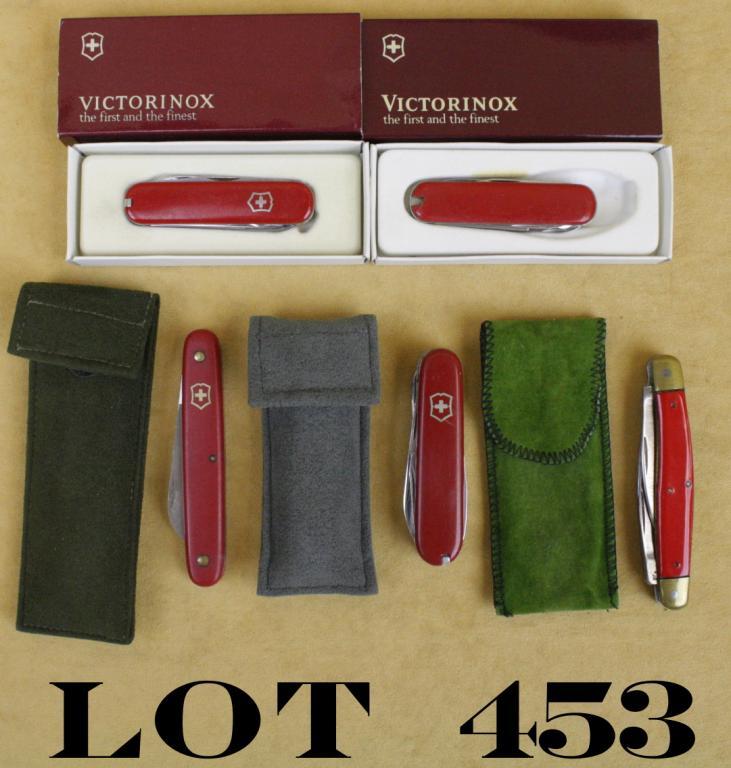 Lot of four Victorinox pocket knives, two in their factory cardboard boxes, two in cloth sheaths and an R.W. Ostwald folder; all in overall good condition. Est.: $35-$45.