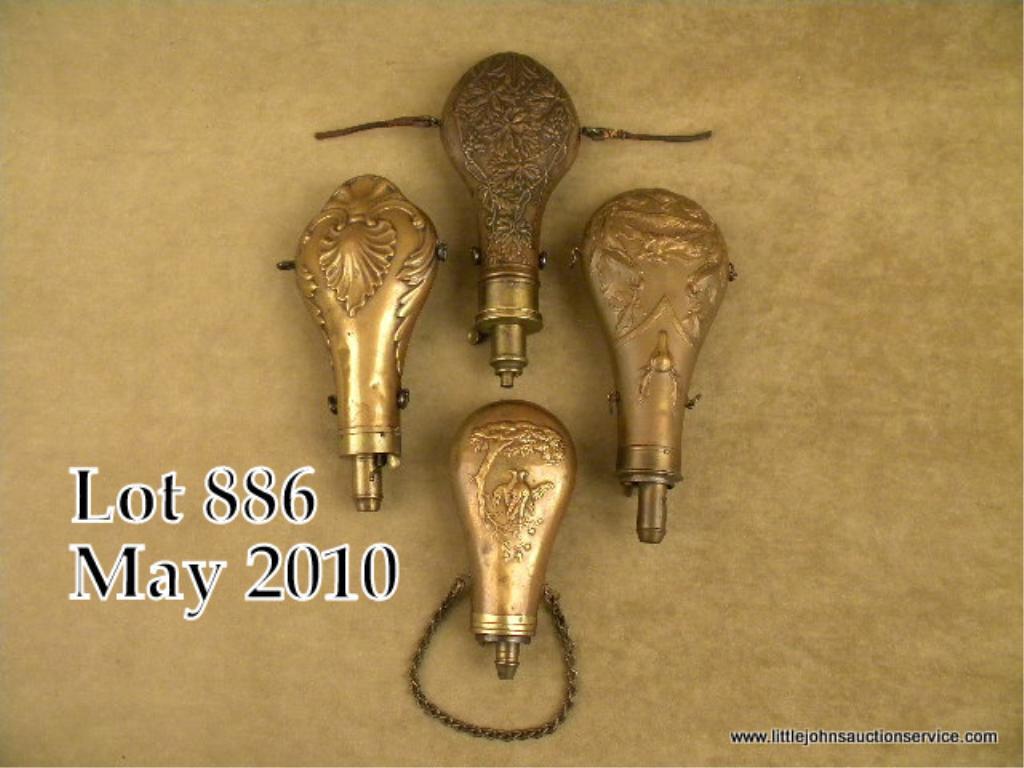 Lot of four antique brass shotgun flasks, all in overall good condition including a large Hawksley signed leaf and vine embossed flask, approx. 8-1/2” x 3-1/2”; an Am. Flask & Cap Co. embossed on one side with Indian and buffalo hunting sceneand deer head scenes, approx. 8” X 4”; a floral and scalloped large flask, approx. 8” x 4” and a game scene flask with hanging chain approx. 6” x 3”. Est.: $200-$300.