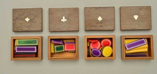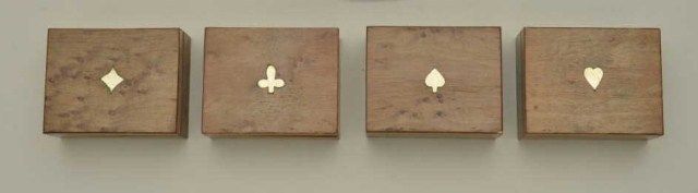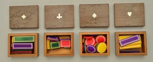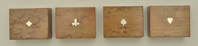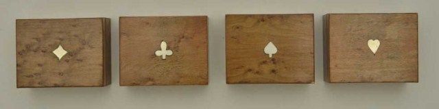 Lot of four birdseye maple boxes full of colored faro chips, each box lid inlaid with a suit type (clubs, diamonds, spades and hearts); boxes are finely constructed and measure approx. 1-3/2” x 2-1/2” x 3” with the chips being colored yellow, red, purple and green and shaped in circular form, long rectangular form and “short” rectangular form; an unusual group of gambling ephemera great for display or use. Est.:$500-$1,000.