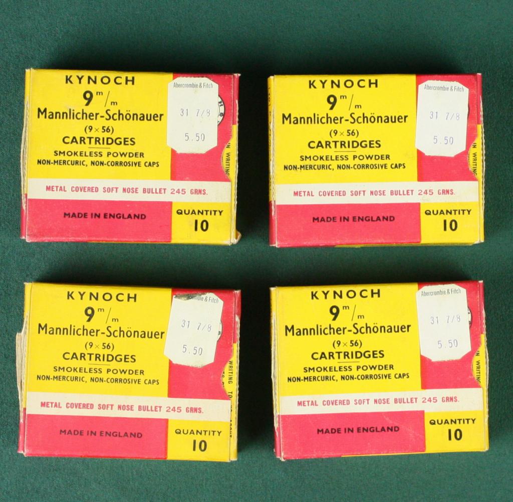 Lot of four boxes of Kynoch 9mm  Mannlicher-Schonauer 9 X 56 cartridges (10 in  each box); all in overall very good  condition.  Est.:  $75-$150.