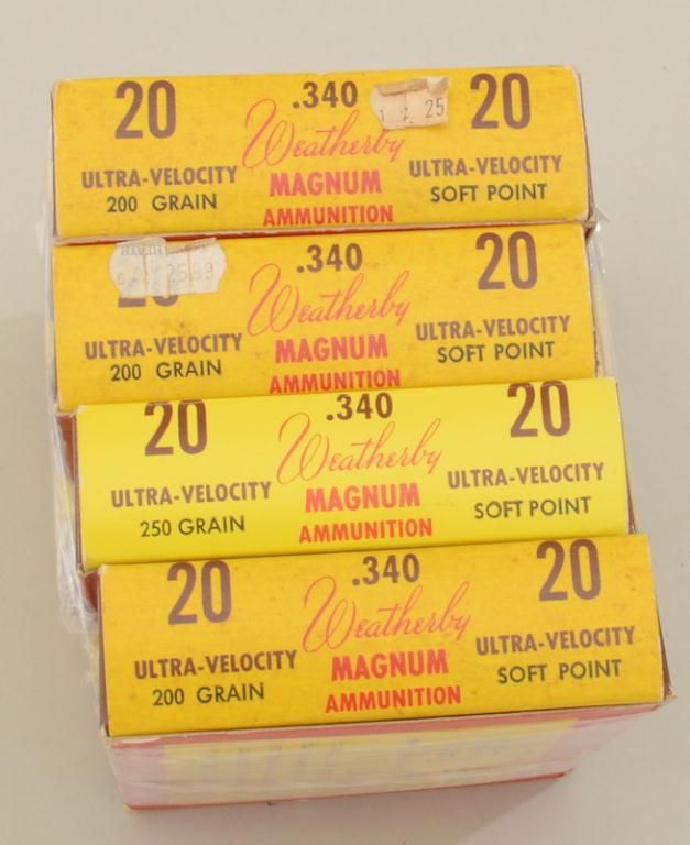 Lot of four boxes of Weatherby .340 Magnum ammunition, ultra-velocity soft point, 200 grain. Est.: $120-$240.