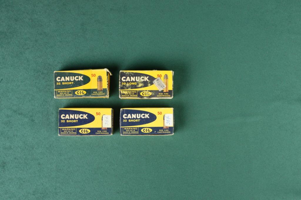 Lot of four collectible boxes of Canuck .32 short cartridges in overall very good condition. Est.: $40-$80.