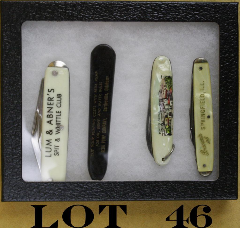 Lot of four collector advertising folding knives in a riker case including a Souvenir of Springfield, Ill. knife, a “Lum & Abner’s Spit & Whittle Club”, a Reda Pump Co., Bartlesville, Oklahoma knife and a souvenirknife from Scotty’s Castle in Death Valley. Est.: $50-$75.