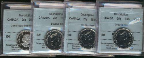 Lot of four interesting varieties. Includes a 1982 "Double date" CCCS MS-66, 1983 "Double date" CCCS MS-66, 1997 "Double date" CCCS SP-67, 2004 "Gold Poppy CCCS PF-67 Ultra heavy cameo.