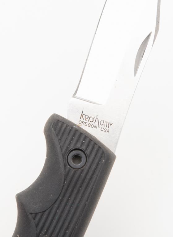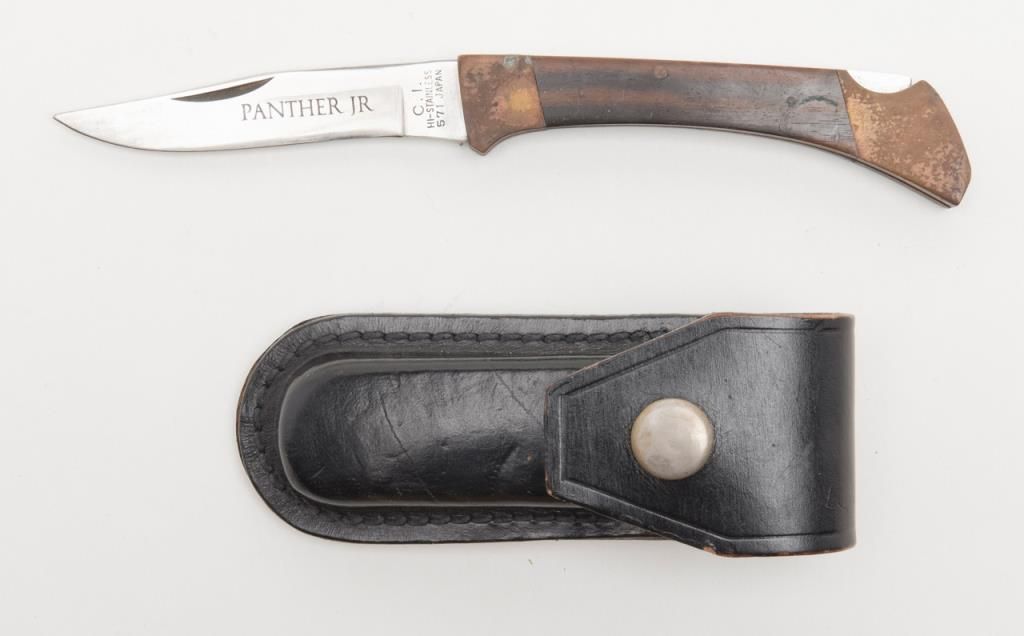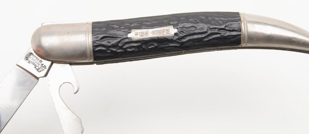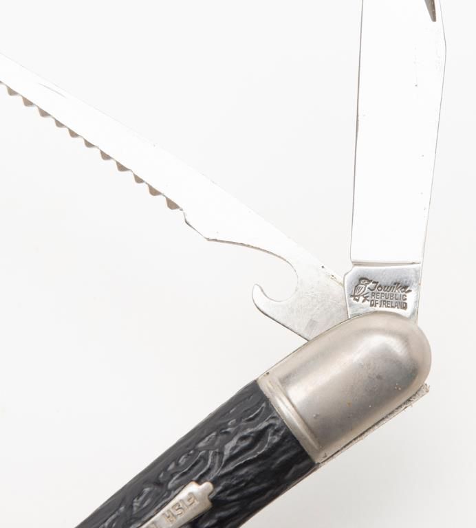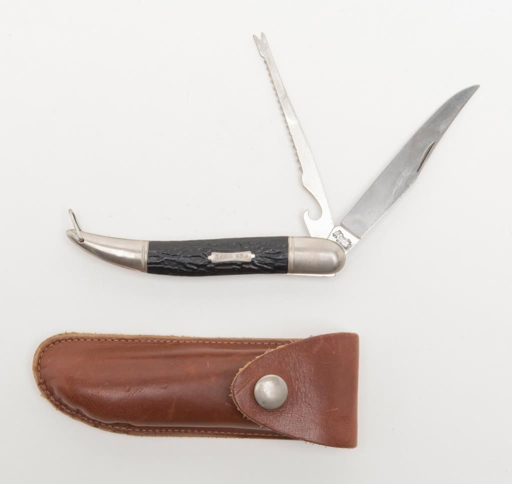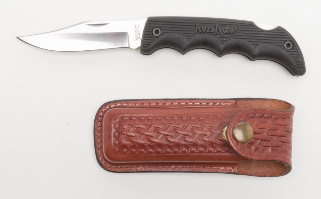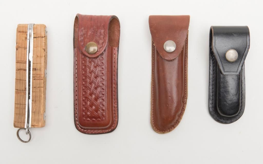 Lot of four knives including folding fisherman’s knife, a Kershaw folder with leather belt sheath; a two blade folder fish knife by Jowika, Ireland with sheath and a small Panther folder in leather sheath. Est.: $25-$50.