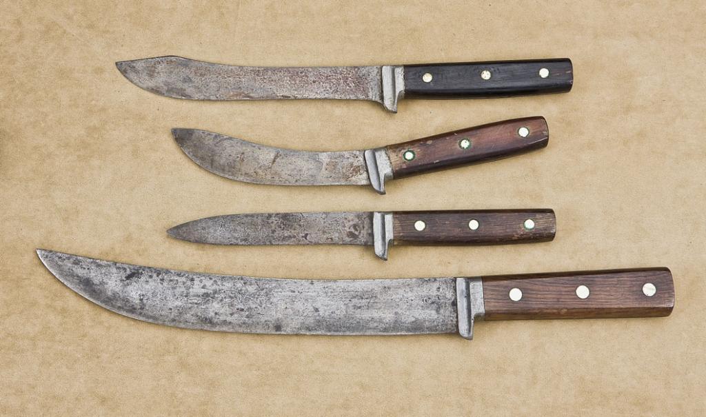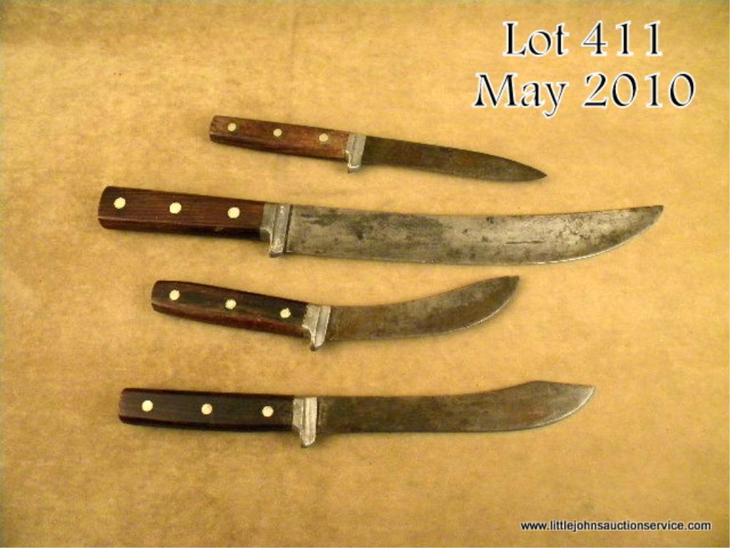 Lot of four large skinning knives, unmarked, all with three rivet wood grips, all with pewter guards and varying blade lengths including 12”, 8”, 6” and 5-1/2”; all in overall good condition, uncleaned and showing great aging with scatteredareas of erosion and pin prick pitting from carry and use. Would go great with a buffalo hunter’s display. Est.: $250-$500.