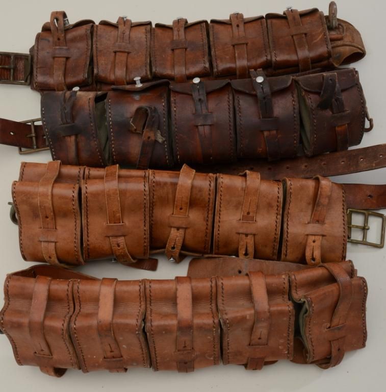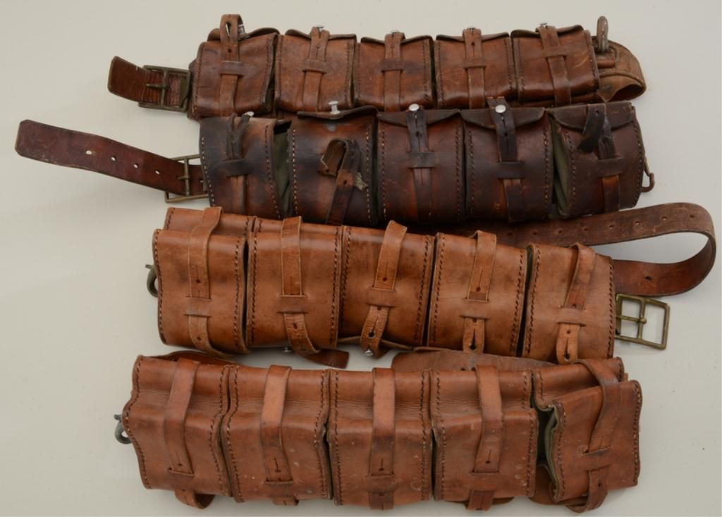 Lot of four leather and canvas European military cartridge belts, each with five attached cartridge holders; all in overall fair to good condition. Est.: $50-$100.
